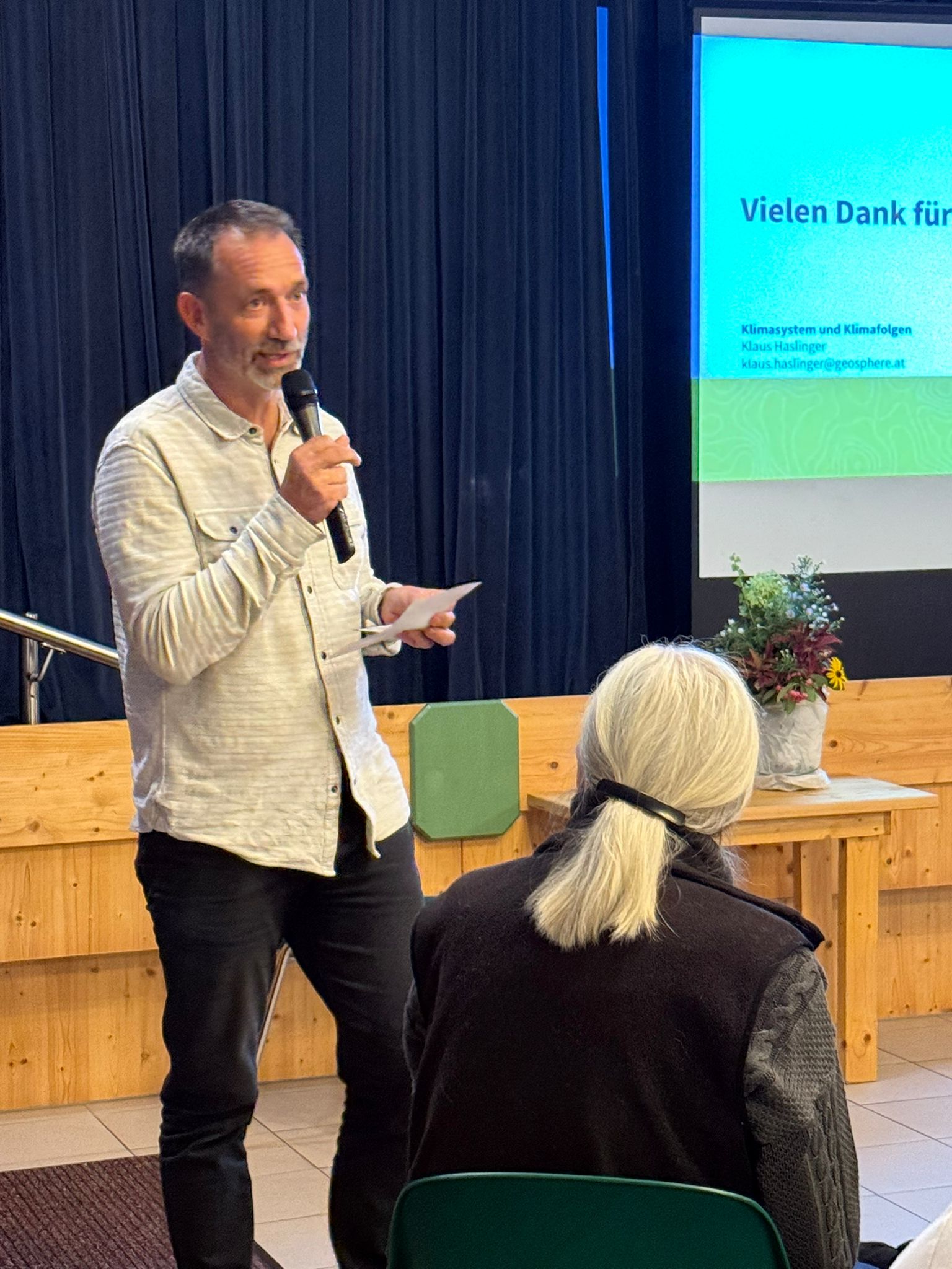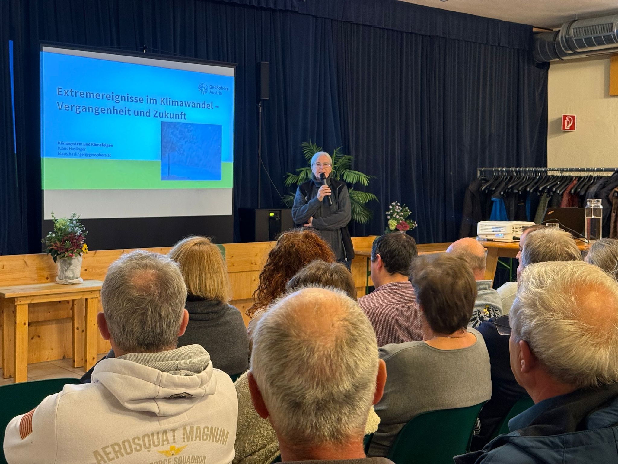Dr. Klaus Haslinger von Geosphere Austria präsentierte verständlich aktuelle Forschungsergebnisse zu diesem komplexen Themenfeld.